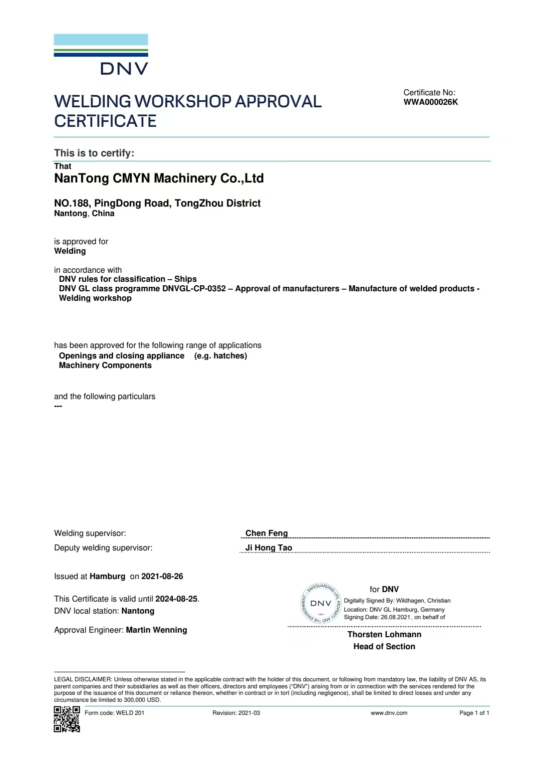 位于工業(yè)發(fā)達(dá)的南通市通州區(qū),南臨上海,地理位置十分優(yōu)越,交通極其便利。 公司生產(chǎn)面積2000㎡,主要生產(chǎn)設(shè)備有數(shù)控火焰切割機(jī),ZQ30-50臺式轉(zhuǎn)床,GT4228臥式帶鋸床,剪板機(jī),折彎機(jī),以及相關(guān)的焊接設(shè)備等,最大單機(jī)起吊能力25T。倉庫200㎡,辦公樓100㎡,公司現(xiàn)有職工20余人,其中管理人員5人,工程師2人,生產(chǎn)工人13人,其中高級技工3人,中級技工5人,初步達(dá)到相關(guān)的生產(chǎn)能力。 公司經(jīng)過多年的發(fā)展,在大型鋼結(jié)構(gòu)制作、非標(biāo)機(jī)械設(shè)備制作、船舶艙口蓋附件、滾裝散貨船配件、有色金屬鑄造(外協(xié))及加工上積累了豐富的制造經(jīng)驗(yàn),形成設(shè)計(jì),制作,安裝全套服務(wù)。 我公司始終如一貫徹以“質(zhì)量第一、用戶至上”的方針,以質(zhì)量為本誠信創(chuàng)業(yè)的企業(yè)精神,以先進(jìn)制造技術(shù),完整的檢測手段和可靠質(zhì)量保證,嚴(yán)格按照GB/T19001-2000質(zhì)量保證體系標(biāo)準(zhǔn),建立了一套完整的,運(yùn)行有效的質(zhì)量程序控制文件,落實(shí)于各職能部門,在生產(chǎn)全過程中實(shí)施,為客戶提供最優(yōu)質(zhì)的服務(wù)與產(chǎn)品。 經(jīng)不斷發(fā)展,創(chuàng)銘伊諾(CMYN)以先進(jìn)的技術(shù),精良的設(shè)備,建全運(yùn)行有效的質(zhì)量保證體系,完善的檢測手段,以及優(yōu)質(zhì)服務(wù)贏得了眾多客戶和社會各界的支持和好評。